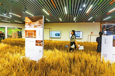 走進展廳,一陣陣濃郁的稻香撲鼻而來。350平方米的場地鋪滿了一叢叢干稻穗,而作品展板就豎立在稻田中央,觀眾可以沿著稻田中的蜿蜒阡陌,在稻香中盡覽設(shè)計之美。